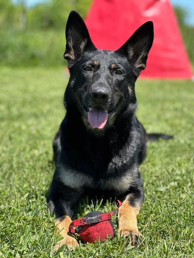 Djara is a biddable dog with high food and ball drive and a lot of possession. She is athletic, agile and eager to work with genetically full grips.